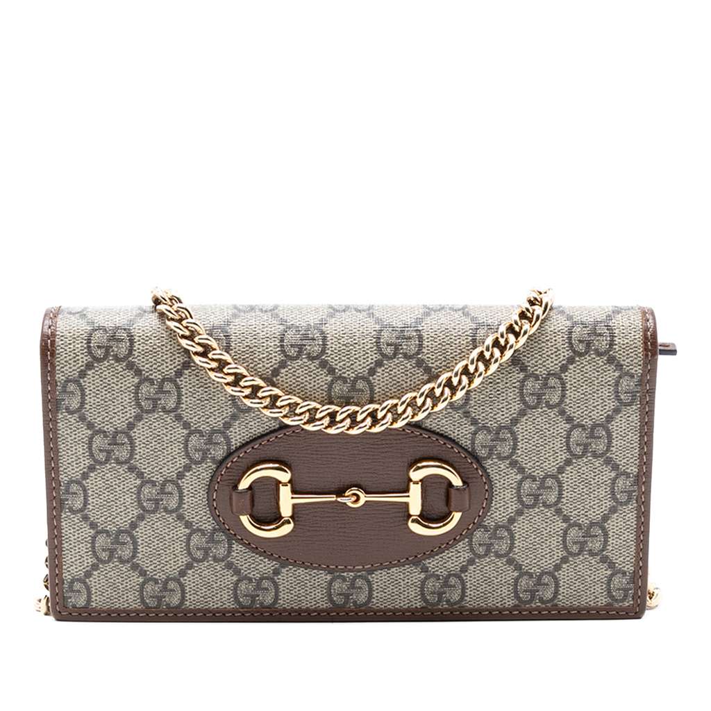 The Horsebit 1955 wallet on chain features a canvas body with leather trim, a gold-tone curb chain link strap, a front flap with a snap button closure, and interior zip and slip pockets.