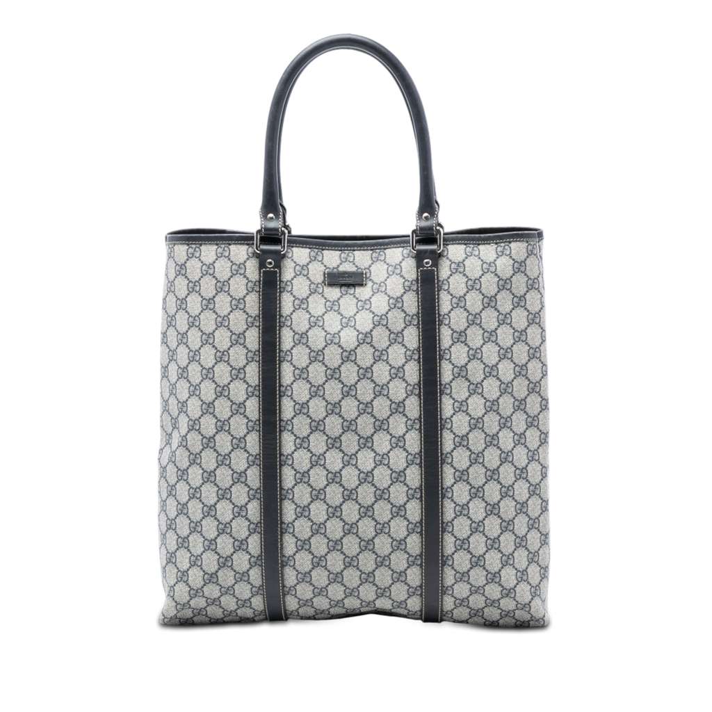 This tote bag features a coated canvas body with leather trim, rolled leather handles, an open top with magnetic snap closure, interior zip and slip compartments, and an interior slip pocket.