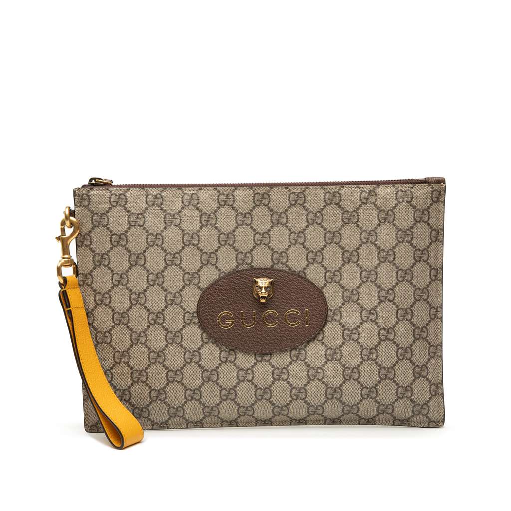 The GG Supreme Neo Vintage clutch features a coated canvas body, a flat wrist leather strap, a top zip closure, and interior slip pockets.
