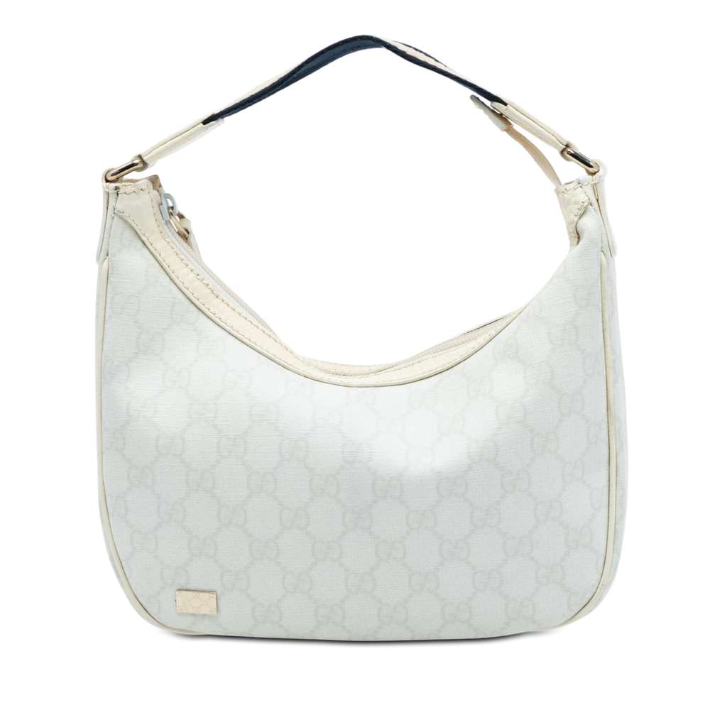 This handbag features a coated canvas body with leather trim, flat strap, top zip closure, and interior pockets.