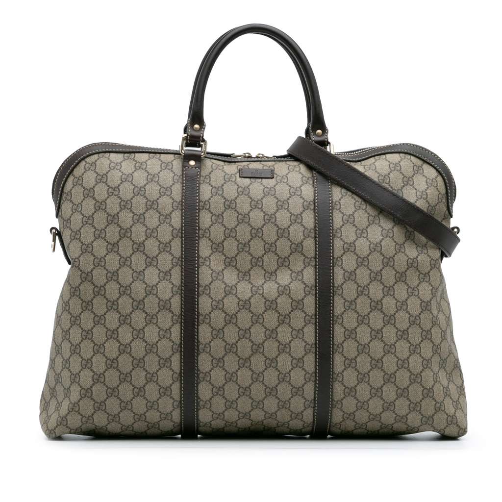 This travel bag features a coated canvas body with leather trim, rolled leather handles, an adjustable and detachable flat leather strap, a top zip closure, and an interior zip pocket.