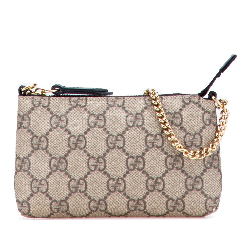 The Ophidia wallet on chain features a coated canvas body, a gold-tone chain strap, and a top zip closure.