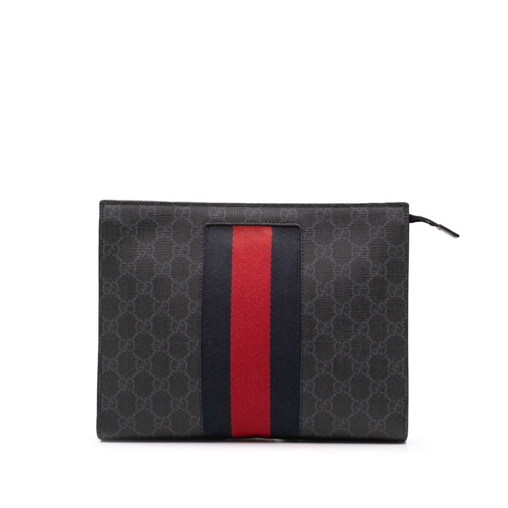 This clutch bag features a coated canvas body with web detail, a top zip closure, and an interior slip pocket.