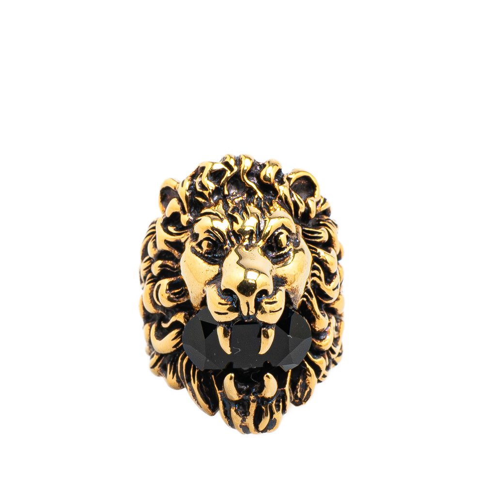 This ring features an antiqued gold-tone body with a textured lions head 3D ornament.
