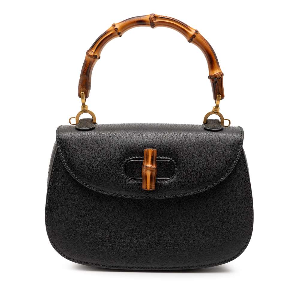 This satchel features a leather body, a bamboo top handle, a detachable flat leather shoulder strap, a front flap with a bamboo twist lock closure, and interior zip and slip pockets.