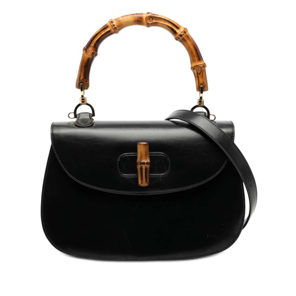 This satchel features a leather body, a bamboo top handle, a detachable flat strap, a front flap with a bamboo twist lock closure, and interior zip and slip pockets.