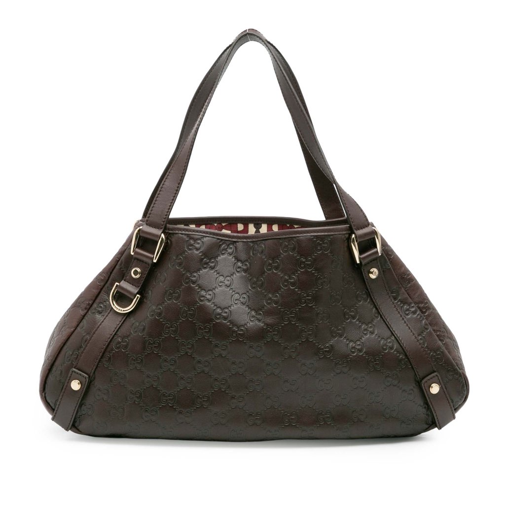 This tote bag features an embossed leather body, flat leather straps, an open top with straps and snap clasp button closure, and interior zip and open pockets.