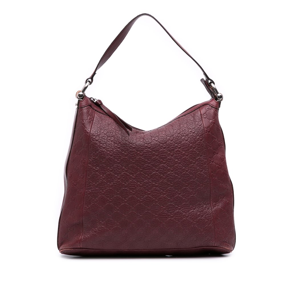 This shoulder bag features an embossed leather body, a flat strap, a top zip closure, and interior zip and slip pockets.