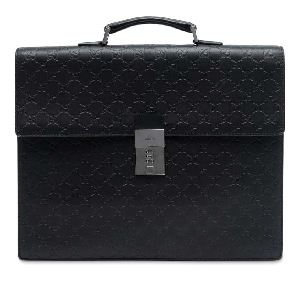 This briefcase features a leather body, a flat top handle, a detachable flat leather shoulder strap, a front flap with a metal closure, interior slip compartments, and interior zip and slip pockets.