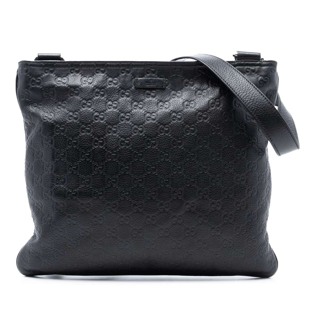 This crossbody bag features an embossed leather body, an adjustable flat leather strap, a top zip closure, and an interior zip pocket.