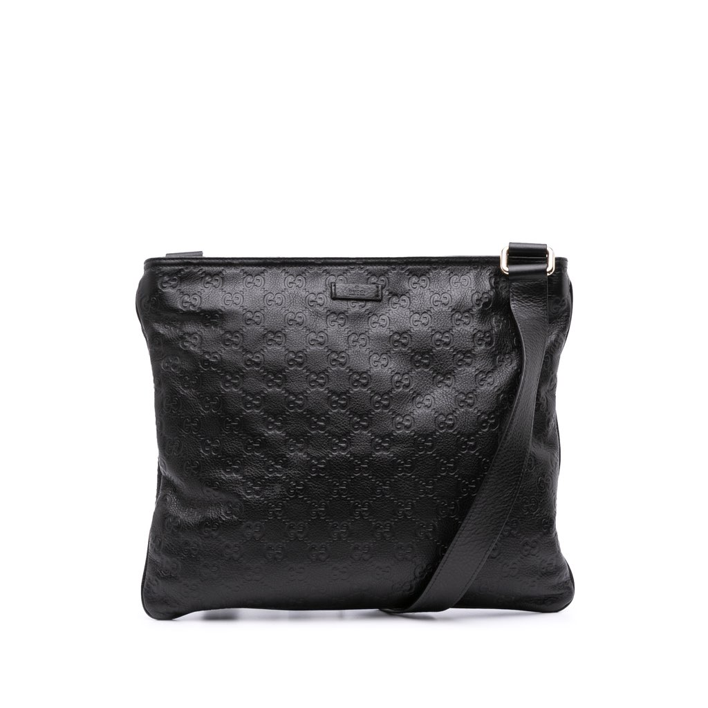 This crossbody bag features an embossed leather body, an adjustable flat leather strap, a top zip closure, and an interior zip pocket.
