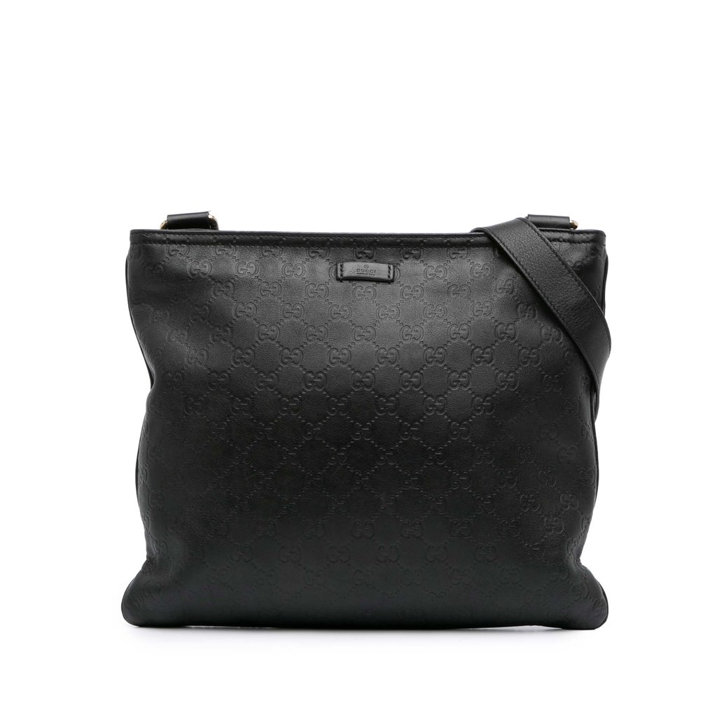 This crossbody bag features an embossed leather body, an adjustable flat leather strap, a top zip closure, and an interior zip pocket. The strap and corners were repainted.
