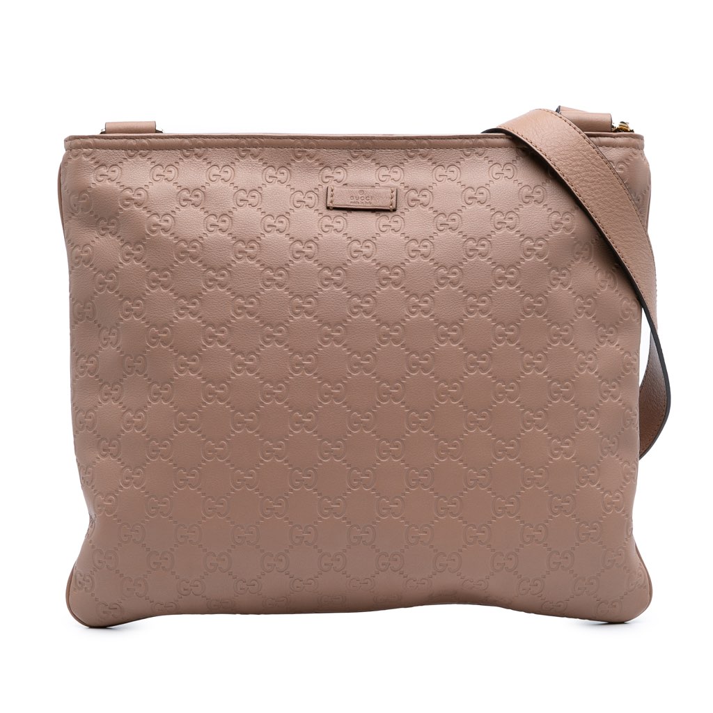 This crossbody bag features an embossed leather body, an adjustable flat leather strap, a top zip closure, and an interior zip pocket.
