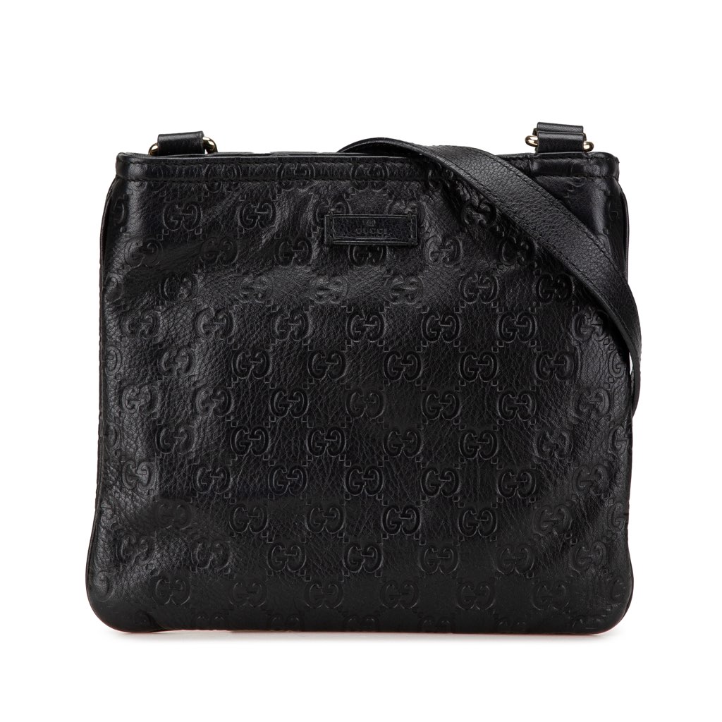 This crossbody bag features an embossed leather body, an adjustable flat leather strap, a top zip closure, and interior zip and slip pockets.