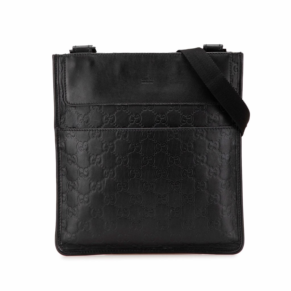This crossbody bag features an embossed leather body, a flat strap, an open top, an exterior slip pocket, and an interior zip pocket.