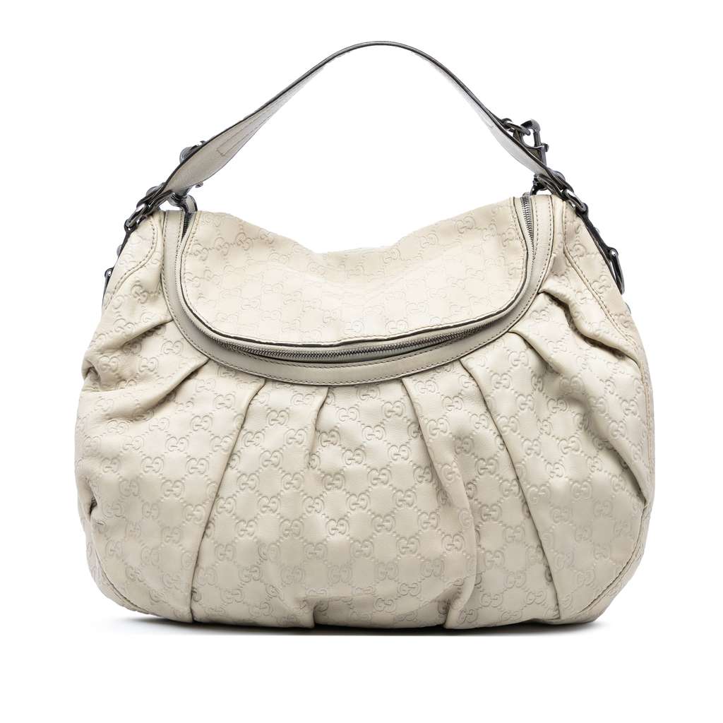 The Guccissima Icon Bit satchel features an embossed leather body, a flat leather handle, a top zip closure, and interior zip and slip pockets.