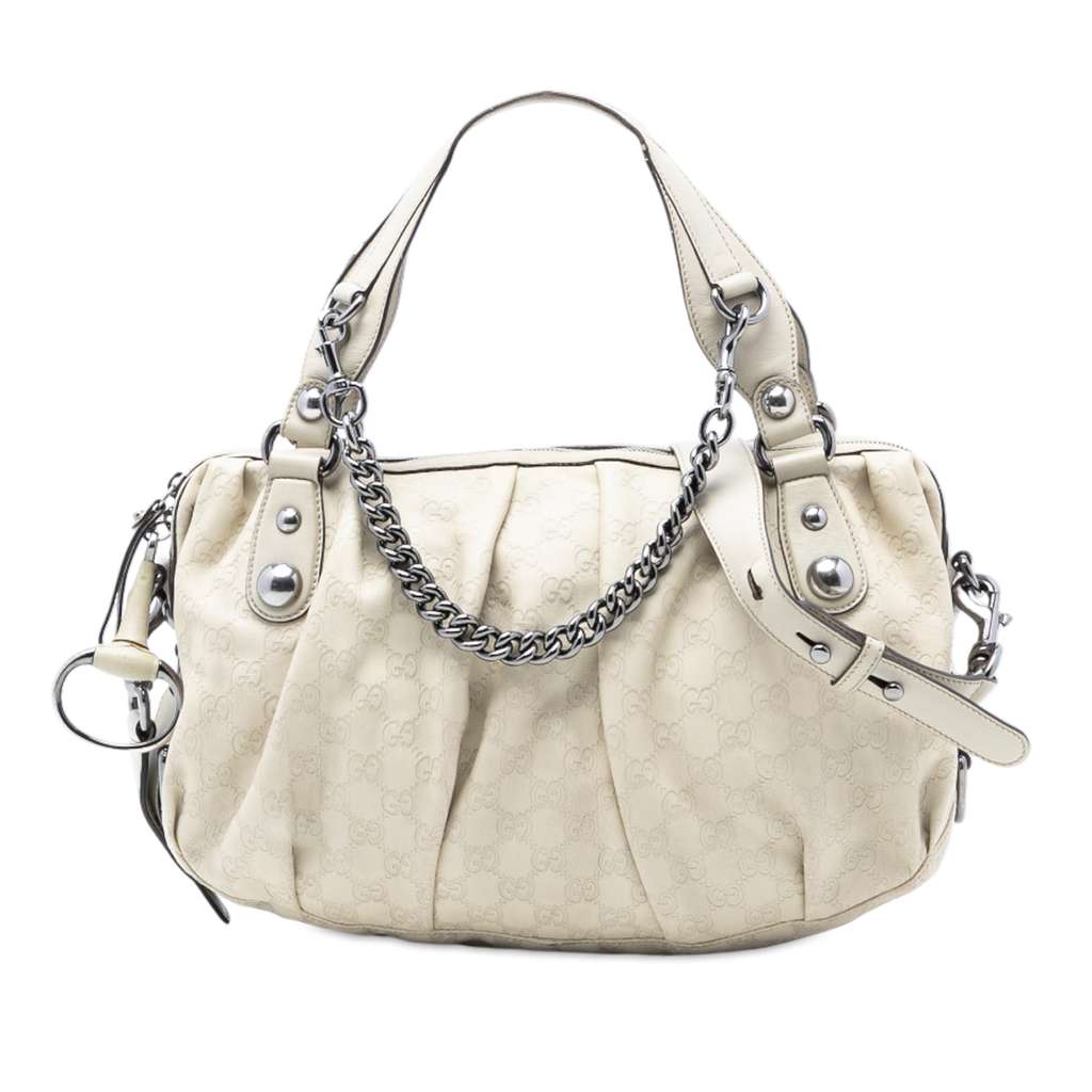 This satchel features a leather body with silver-tone hardware, flat leather handles, a detachable chain and leather strap, a top zip closure, and interior zip and slip pockets.