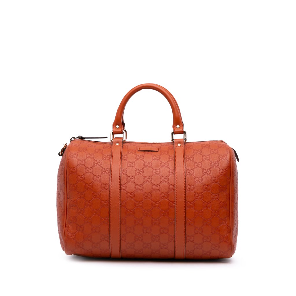 This boston bag features an embossed leather body, rolled leather handles, a top zip closure, and an interior slip pocket.