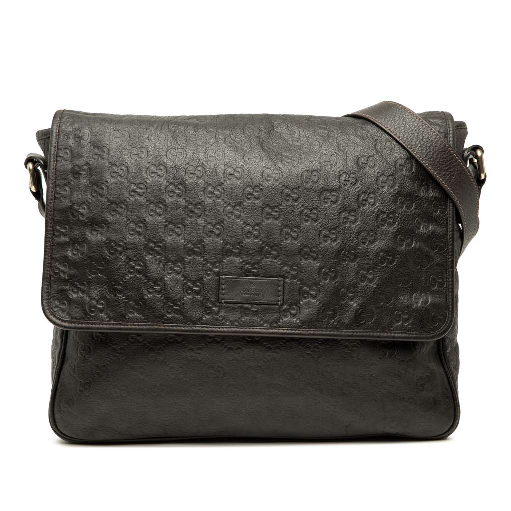 This messenger bag features an embossed leather body, a flat adjustable strap, a top flap with magnetic snap button closure, and interior zip and slip pockets.