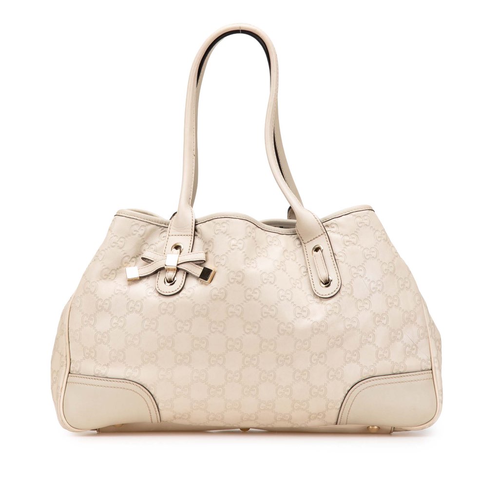 The Princy features an embossed leather body, rolled leather handles, an open top with flap strap and snap button closure, and interior zip and slip pockets.