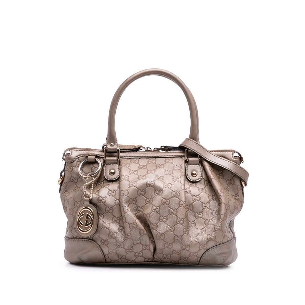 The Sukey features a leather body, rolled leather handles, a detachable strap, a top zip closure, and interior zip and slip pockets.