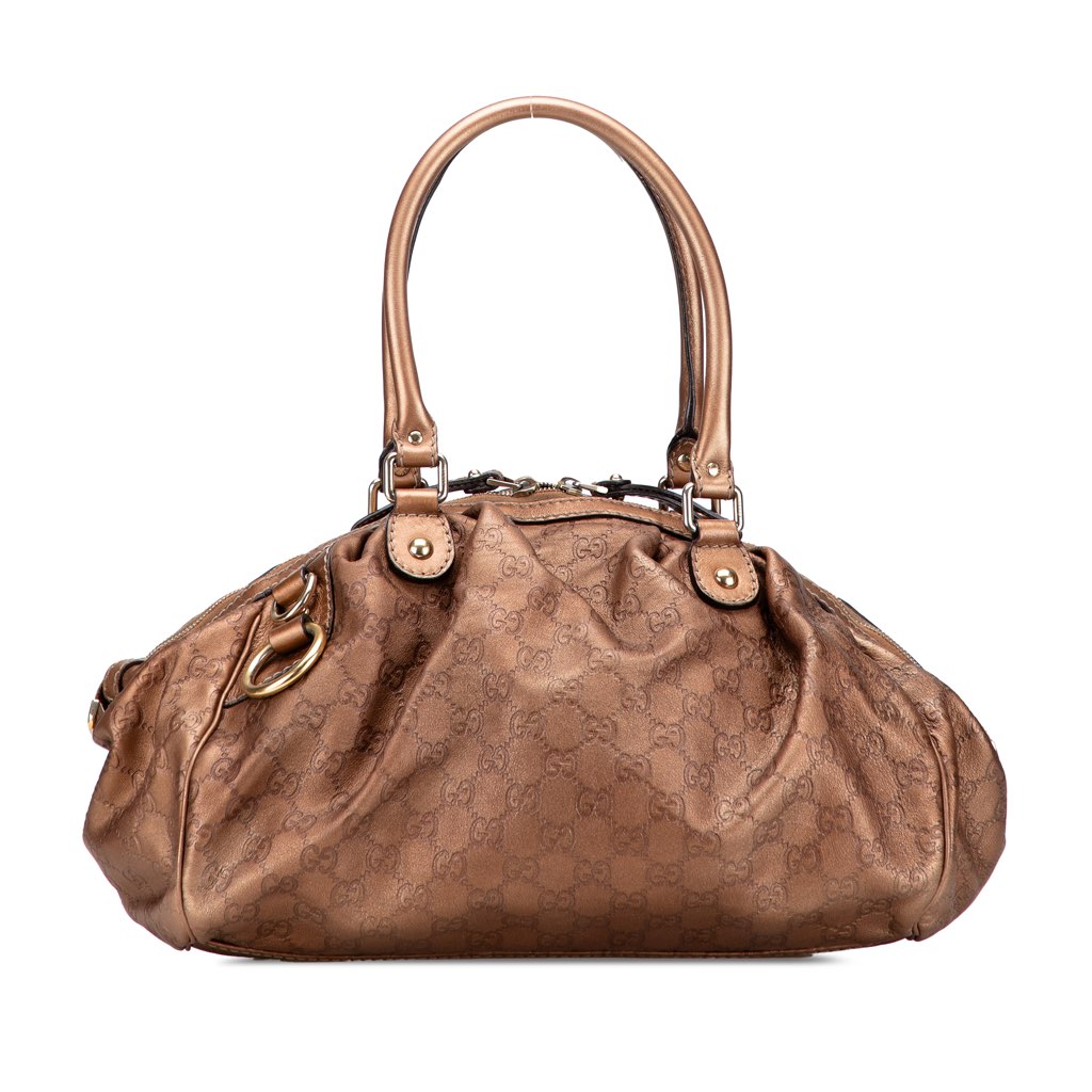 The Sukey satchel features an embossed leather body, rolled leather handles, a top zip closure, and an interior zip pocket.