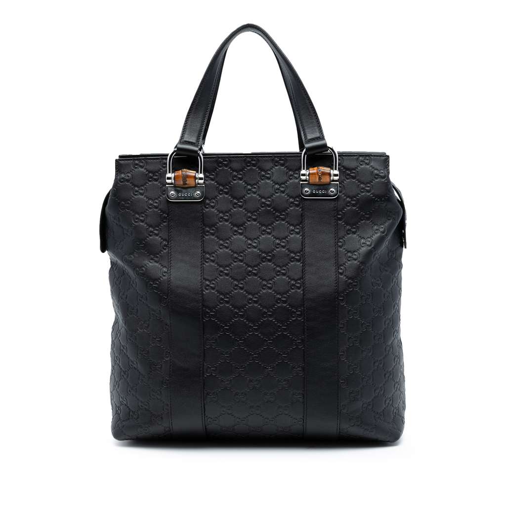 This tote bag features a leather body, flat leather handles with bamboo accents, a top zip closure, and interior zip and open pockets.