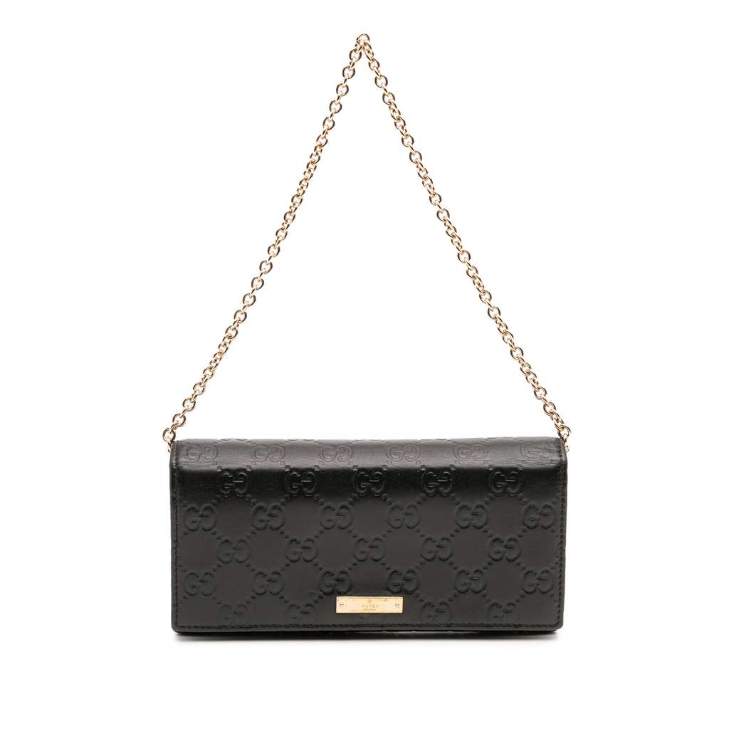 This shoulder bag features an embossed leather body, a detachable chain link strap, a front flap with magnetic snap closure, and interior zip and slip pockets and card slots.