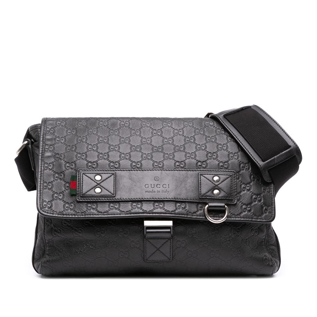 This crossbody bag features an embossed leather body, a flat leather strap, a top flap with magnetic snap button closure, and an interior zip and slip pocket.