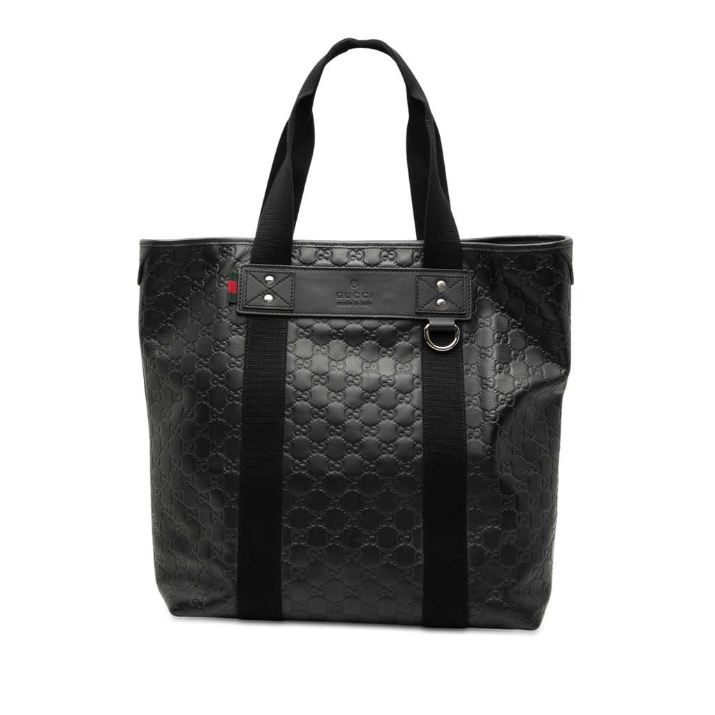 This tote features an embossed leather body, flat canvas straps, an open top with snap button closure, and interior zip and slip pockets.