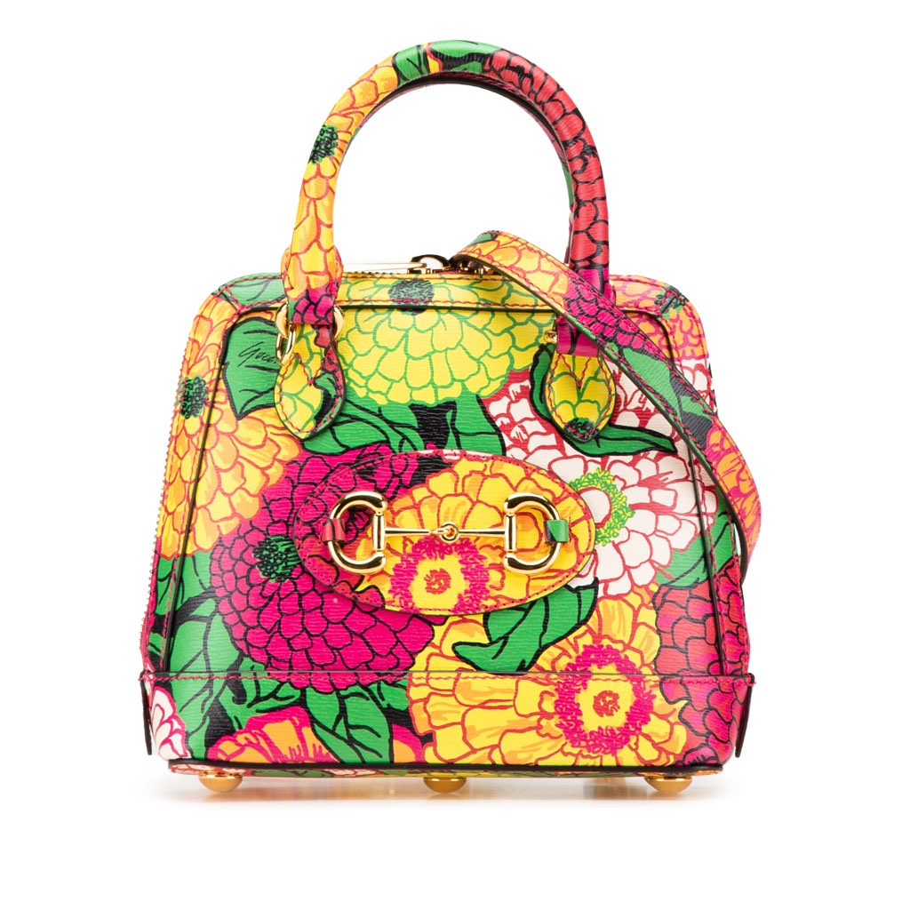 The Horsebit 1955 satchel features a printed leather body, rolled leather handles, a detachable flat leather strap, a top zip closure, and an interior slip pocket.