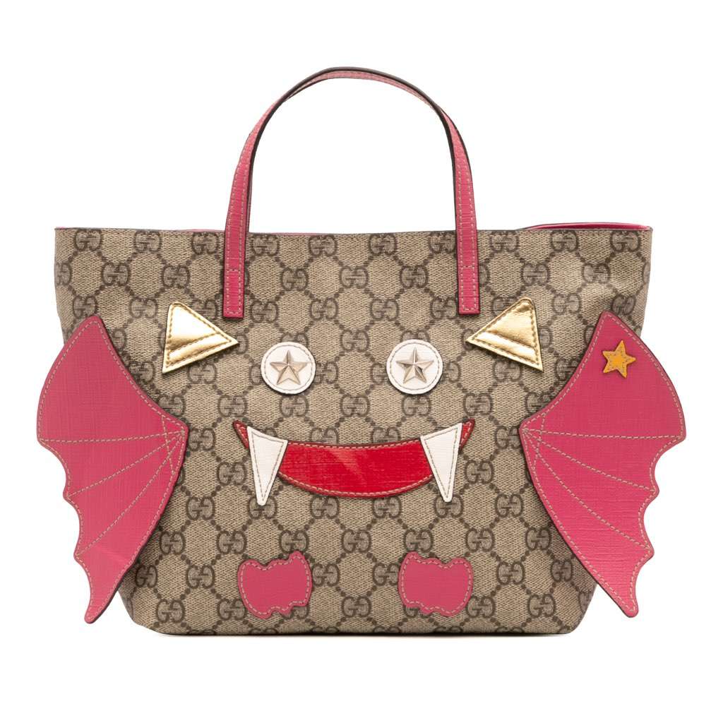 This handbag features coated canvas body with leather trim, flat leather straps, an open top with magnetic snap closure, and an interior slip pocket.