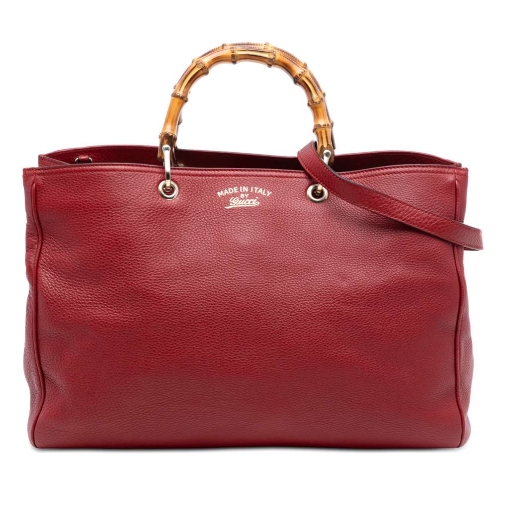 This satchel features a leather body, bamboo handles, a detachable leather strap, an open top with snap button closure, an interior zip compartment, and interior zip and slip pockets.