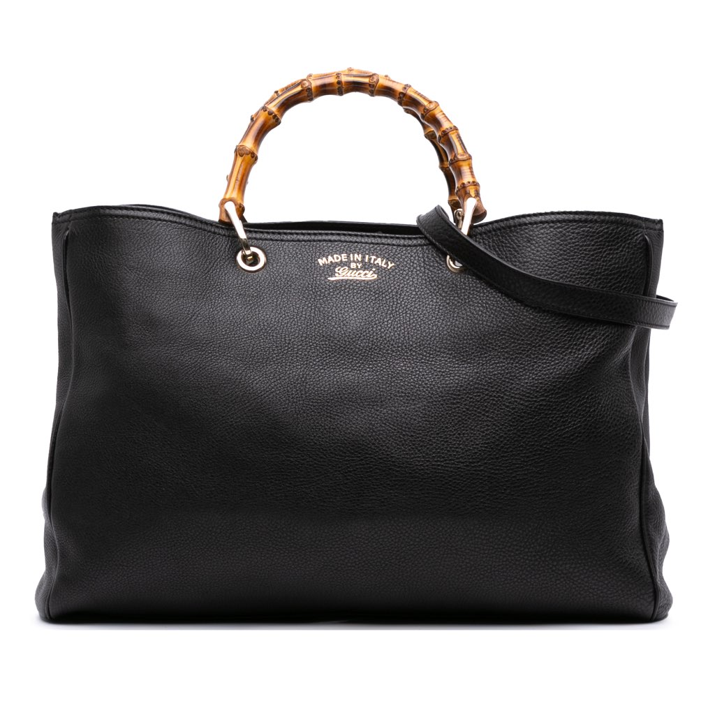 This satchel features a leather body, bamboo handles, a detachable leather strap, an open top with snap button closure, an interior zip compartment, and interior zip and slip pockets.