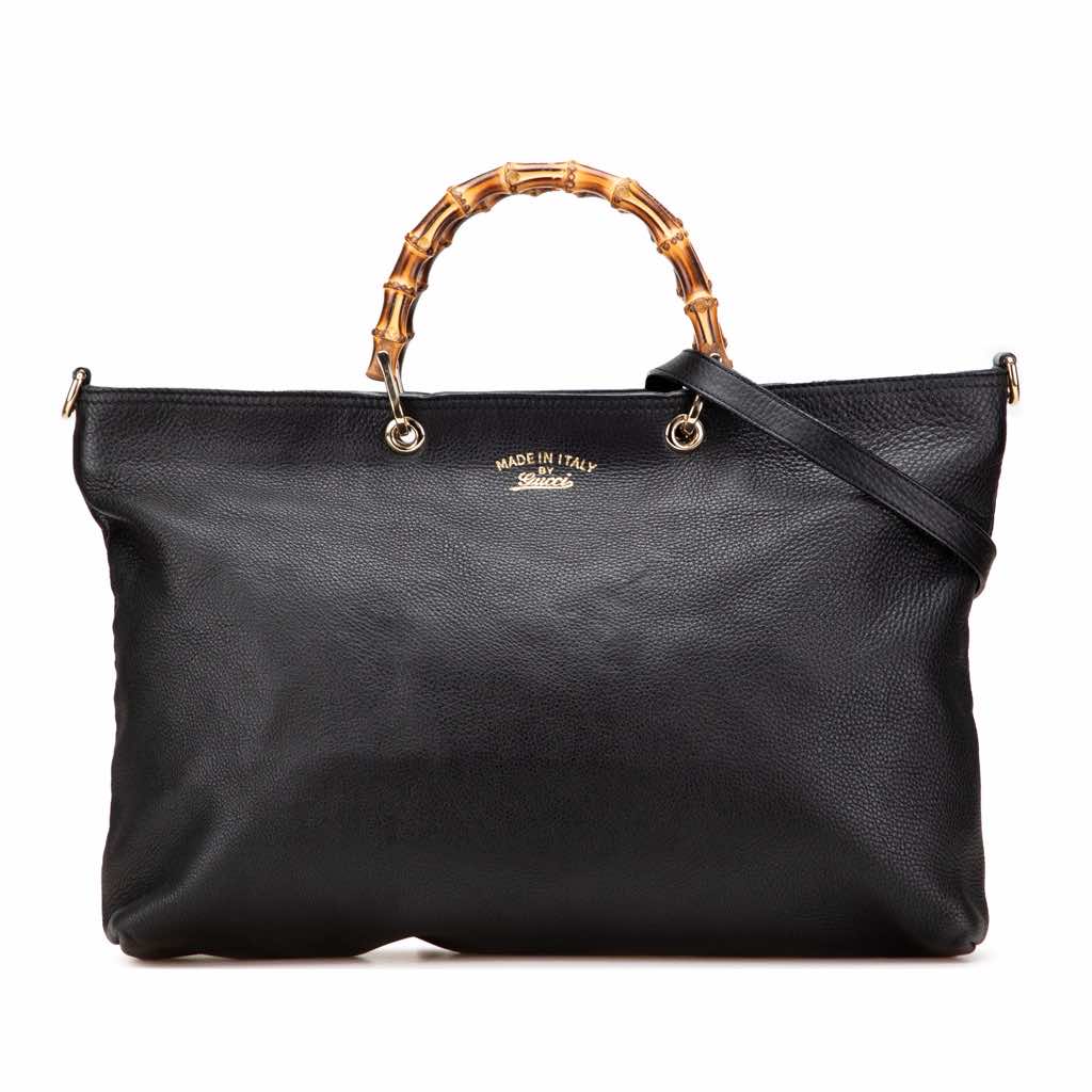 This satchel features a leather body, bamboo handles, a detachable leather strap, an open top, and interior zip and slip pockets.