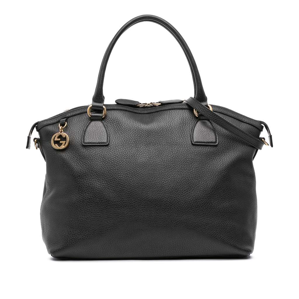 This satchel features a leather body, rolled handles, a detachable flat leather strap, a top zip closure, and interior zip and slip pockets.