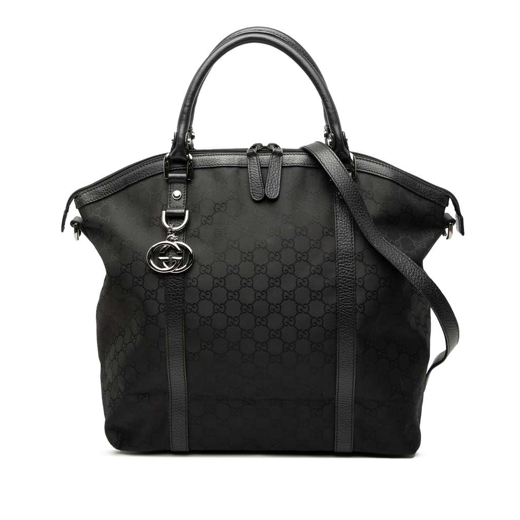 The Dome satchel features a nylon body, rolled leather handles, a detachable flat leather strap, a top zip closure, and interior zip and slip pockets.
