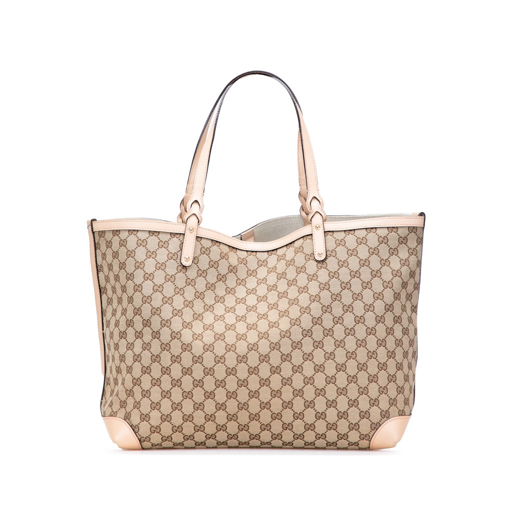 This tote bag features a canvas body with leather trim, flat leather handles, an open top with a lobster clasp closure, and a pouch inclusion.