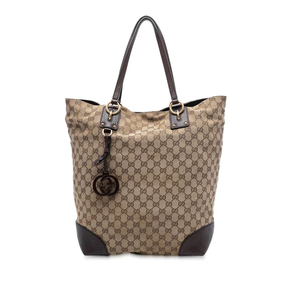 This tote bag features a canvas body with leather trim and a GG charm, flat leather handles, an open top with a magnetic snap closure, and interior zip and slip pockets.