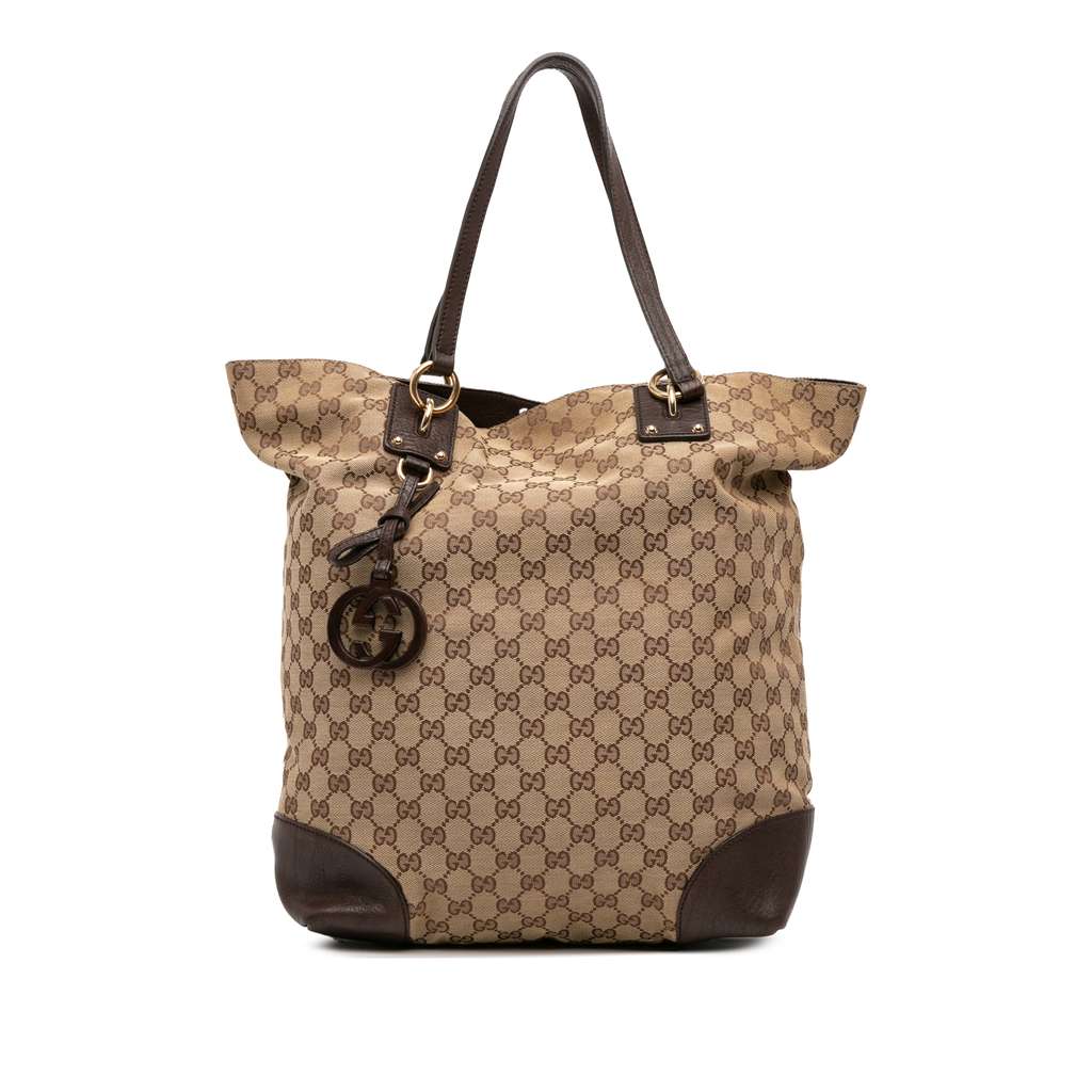 This tote bag features a canvas body with leather trim and a GG charm, flat leather top handles, an open top with a magnetic snap closure, and interior zip and slip pockets.