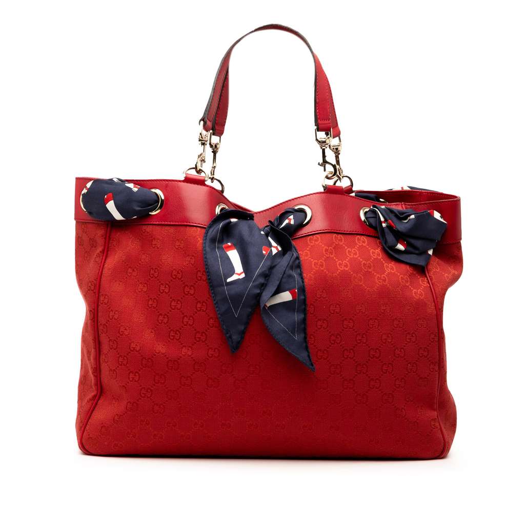 This tote bag features a canvas body with leather trim and scarf embellishment, flat leather handles, an open top, and interior zip and slip pockets.