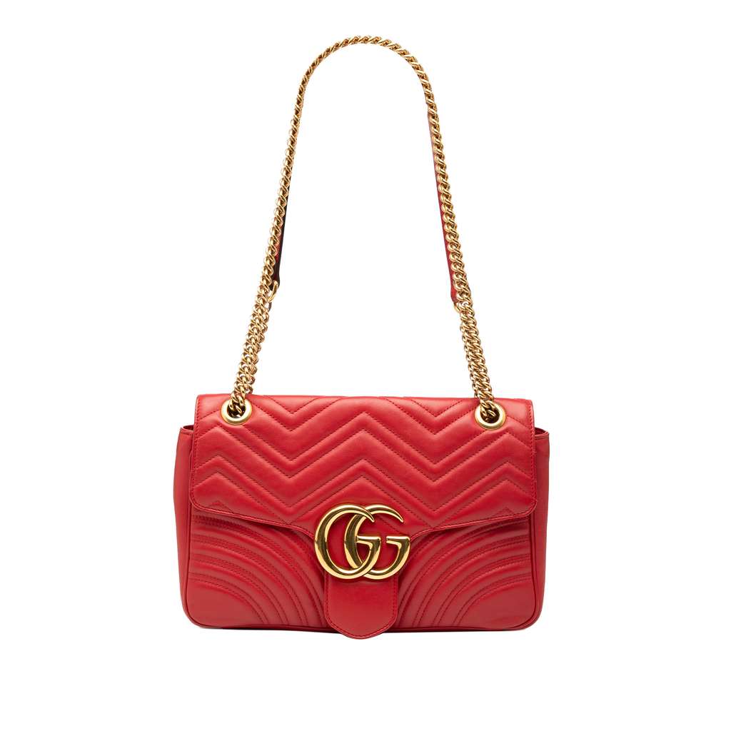 This shoulder bag features a quilted leather body, a curb chain strap with a leather guard, a front flap with a push lock closure, and interior zip and slip pockets.