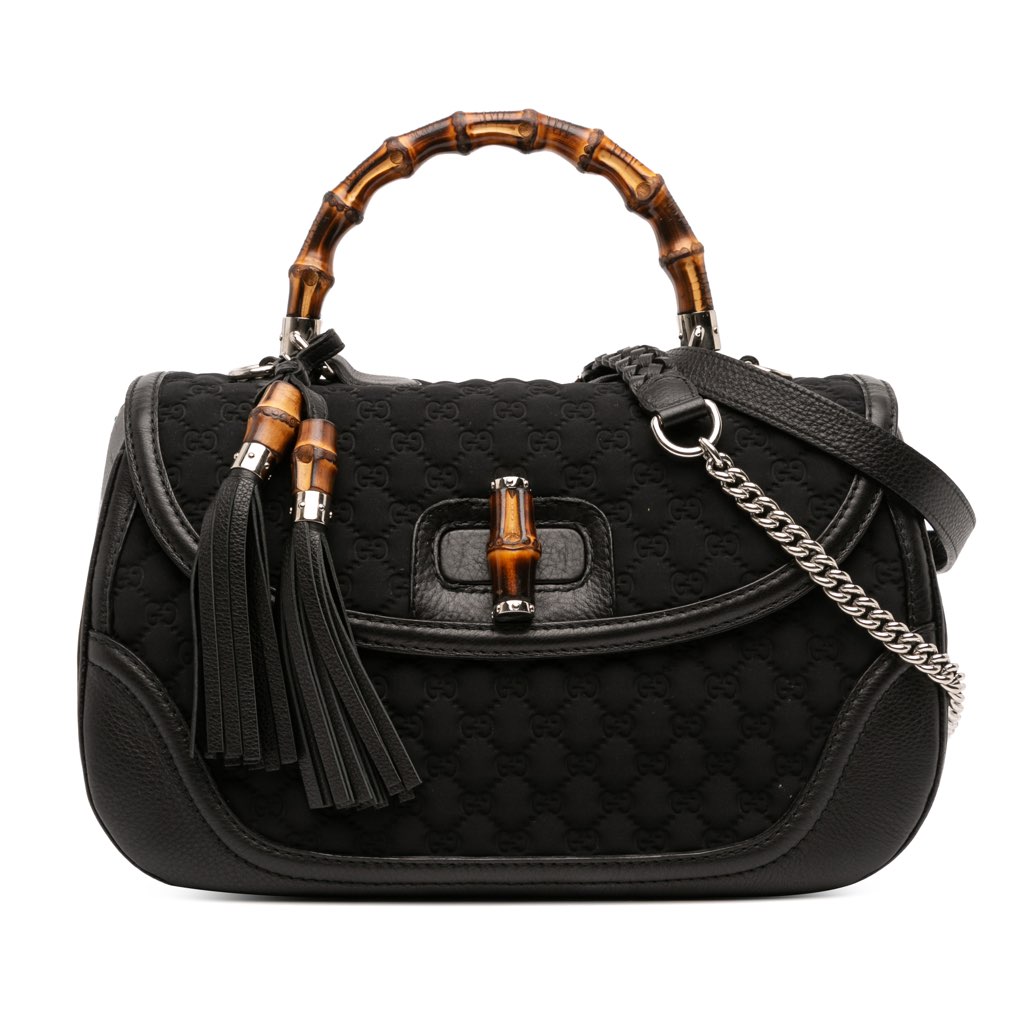 This satchel features a neoprene body with leather trim, a bamboo top handle, a detachable curb chain strap, a front flap with a bamboo twist lock closure, and interior zip and slip pockets.