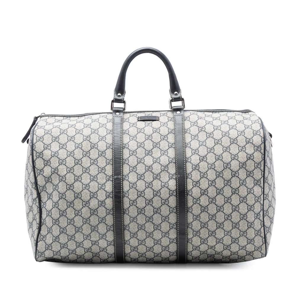 The duffel bag features a coated canvas body with leather trim, rolled leather handles, a top zip closure, and an interior slip pocket.
