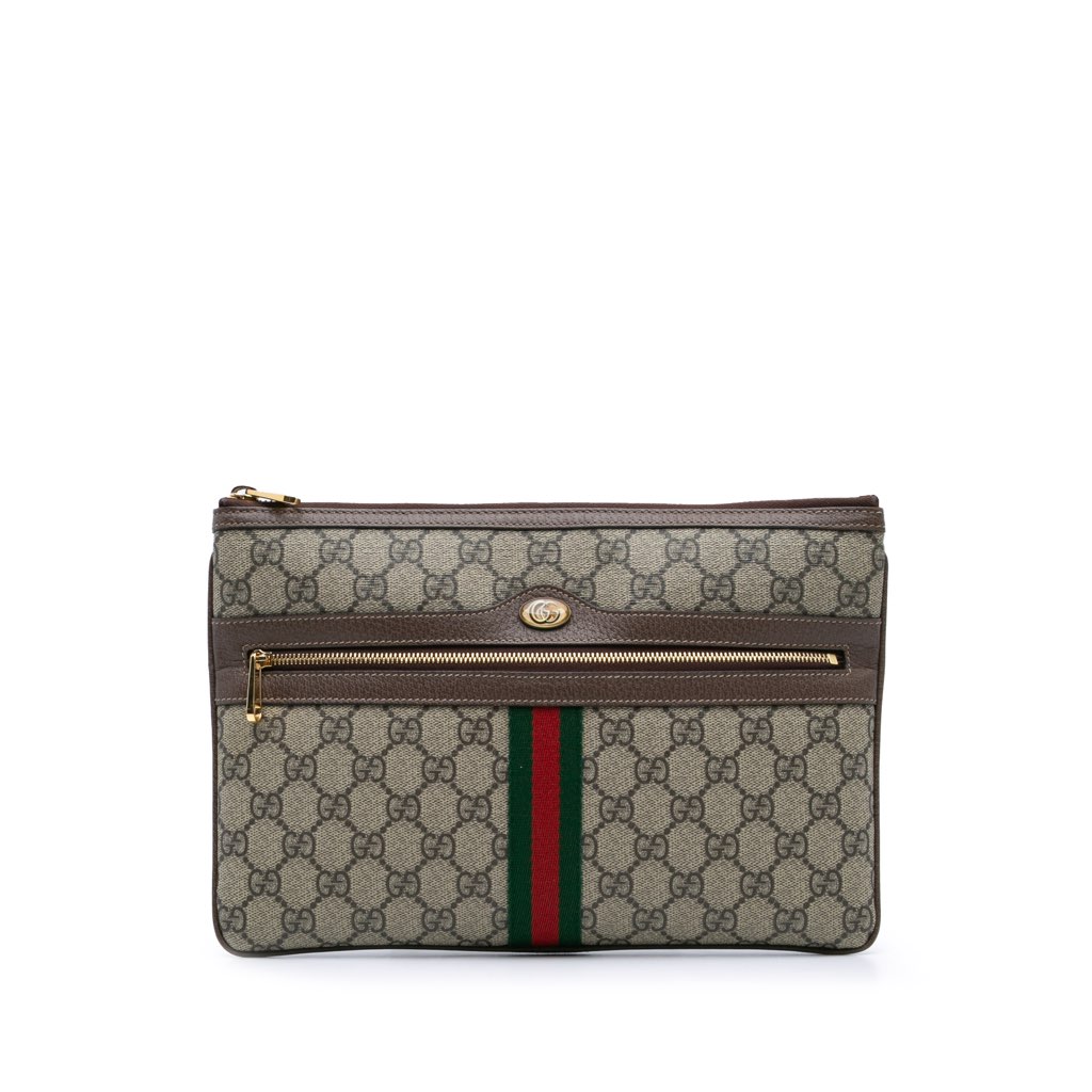 This clutch bag features a coated canvas body with leather trim, a top zip closure, and an exterior zip pocket.