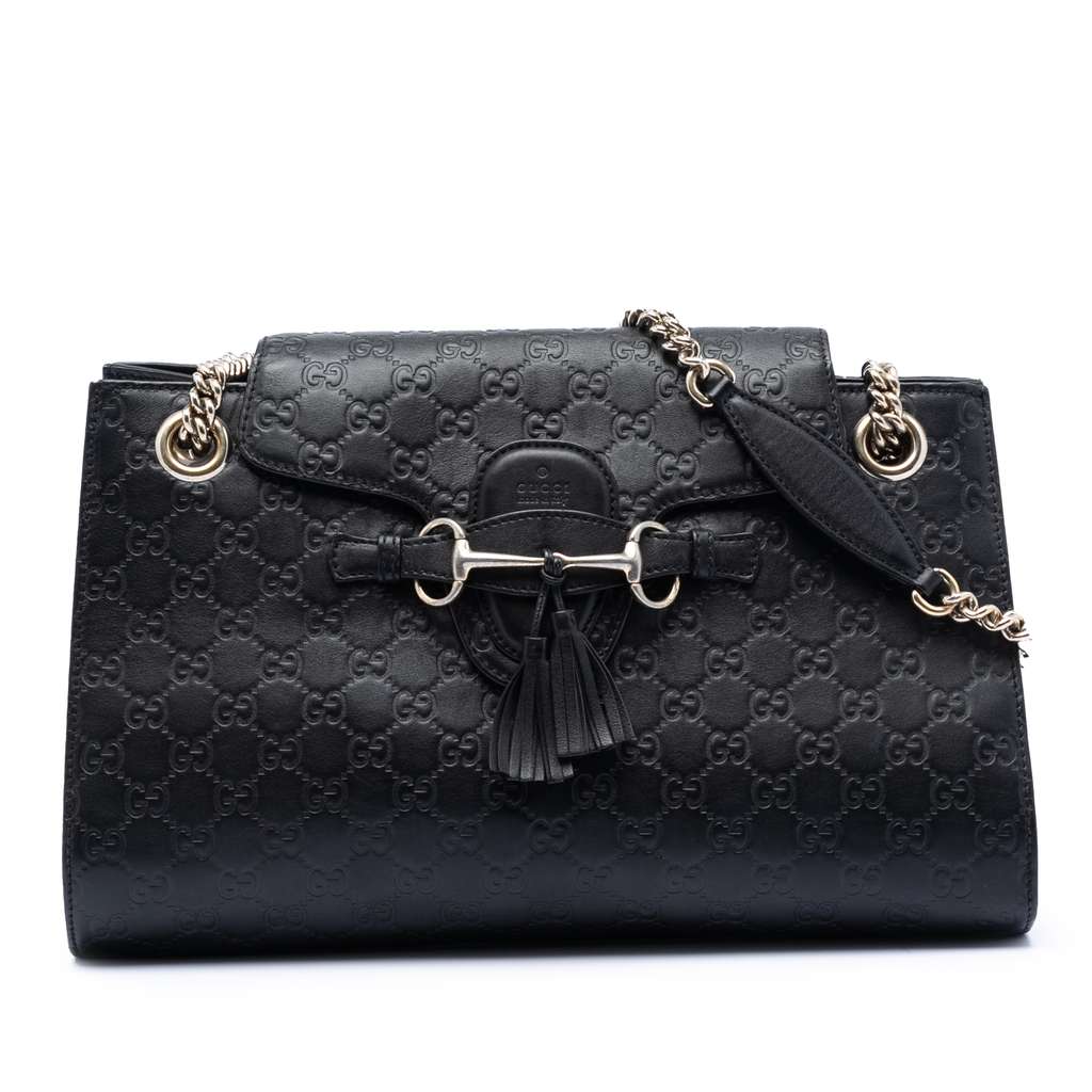 The Emily shoulder bag features a leather body, chain link straps with leather shoulder guards, a front flap with slip through closure, and interior zip and open pockets.