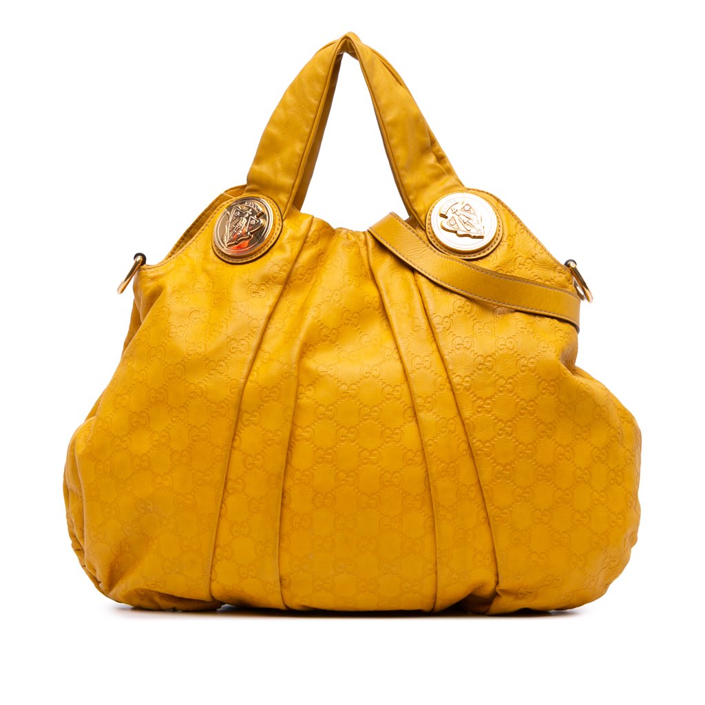 The Hysteria Bag features an embossed leather body, flat leather handles, a detachable flat leather strap, an open top with magnetic snap closure, and interior zip and open pockets.