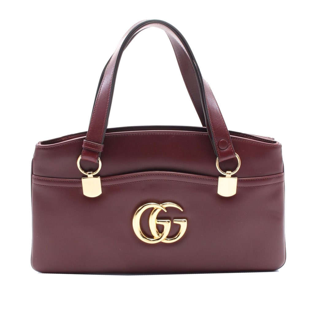 The Arli features a leather body with gold-tone hardware, flat leather straps, top zip closures, exterior front and back slip pockets, and interior zip and slip pockets.