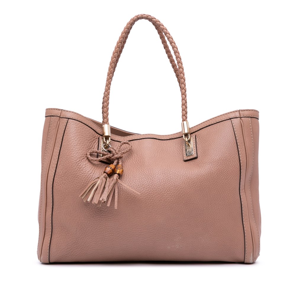 The Bella tote bag features a leather body, braided straps, an open top with lobster clasp closure, interior zip and slip compartments, and interior zip and slip pockets.