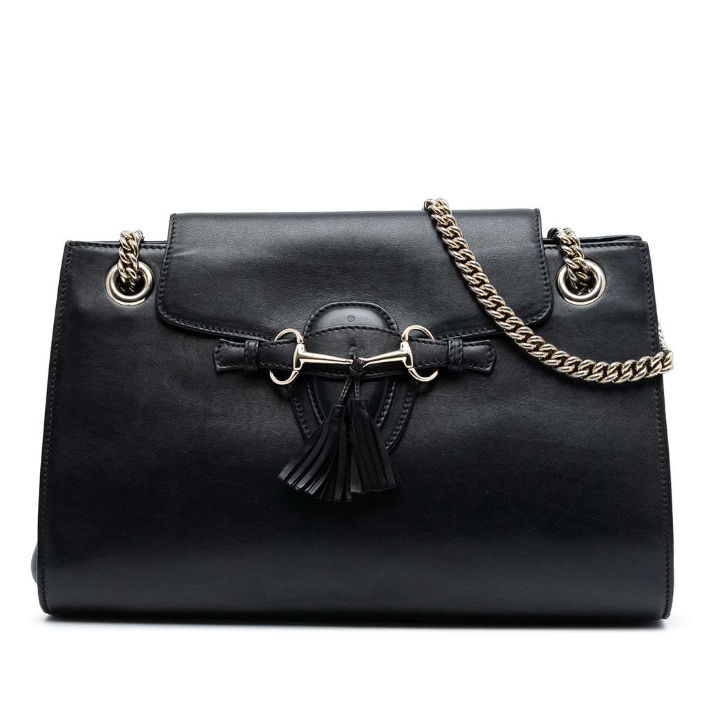 The Emily shoulder bag features a leather body, chain straps with flat leather shoulder guards, a front flap with slip through closure, and interior zip and open pockets.